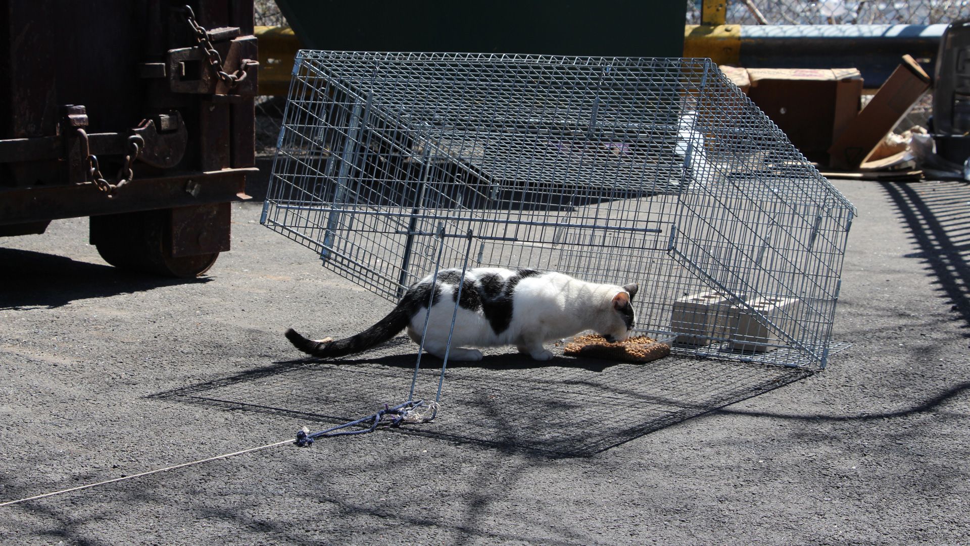 The drop trap Is a favorite tool of many experienced trappers. Cats are not as wary of going under a drop trap as they are of going into a regular trap. This makes it possible to capture cats who are otherwise hard to catch. The drop trap is also effective when you're after one particular cat but not others, such as the last unfixed cat in your colony, a newcomer, an injured cat or a young kitten. Other uses include catching a mom and her kittens at the same time or multiple cats at once. In the video below, see the drop trap in action as we target a newly arrived pregnant female (the black cat on the fence.)